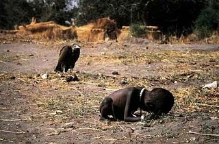 Kevin Carter was a South African Photojournalist who, in March 1993, took the most infamous photograph, so far, of the brutality and disregard for human suffering in sub-Saharan Africa. The photo shows a female Sudanese toddler, alone and severely emaciated, attempting to crawl to an aid station for food. A vulture is standing on the ground behind her, waiting for her to die so it can eat her.
