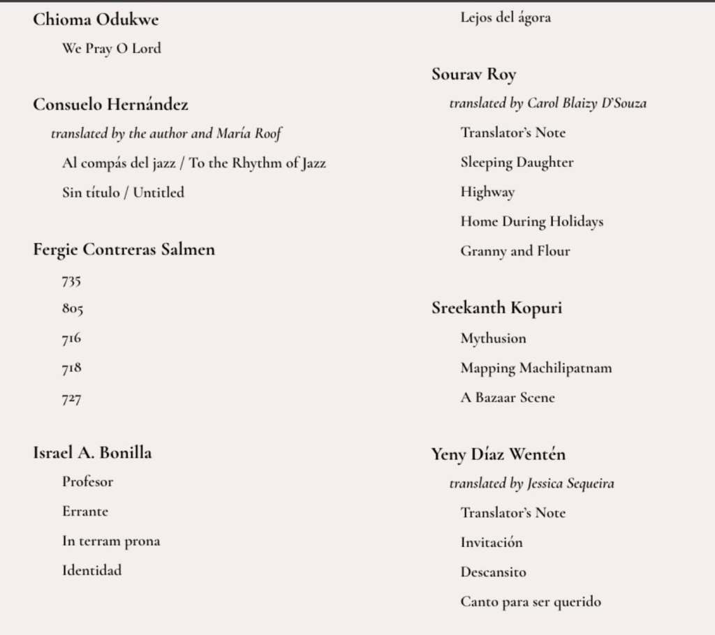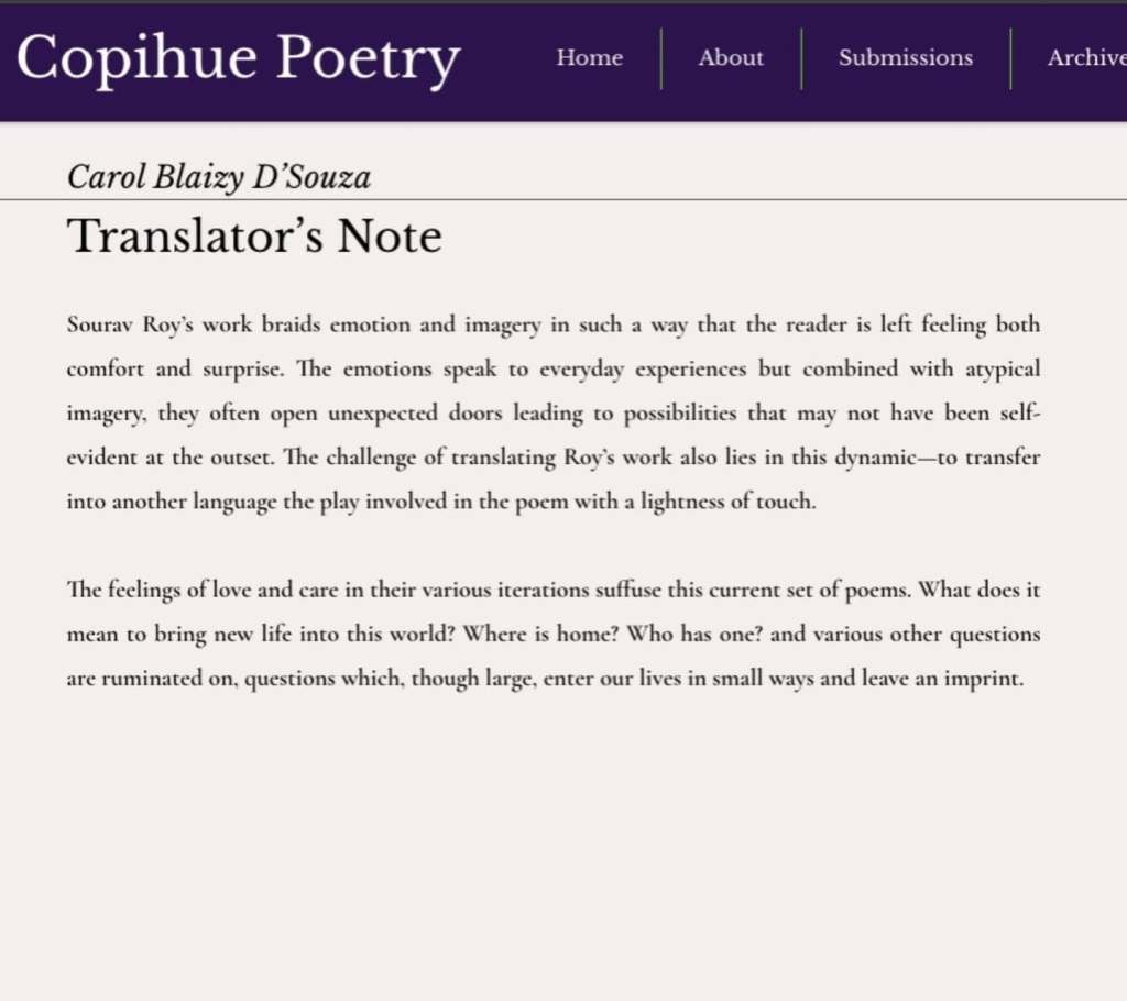 Original poems and their translations by Carol D’Souza, published in Copihue Poetry, a Chile-based magazine